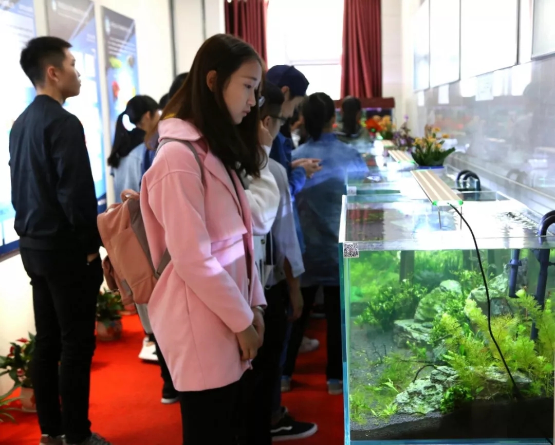 首先看到的是走廊外侧动科院的成果展示区,展示区内有四个水族箱,都采用沉木、形色各异的石头与水草的结合,构建了一个个主题风格不同,却都十分精美的水中微世界.作为一个创新创业项目而言,其创新点主要包括两点:第一,这些缸内形成了一个微生态系统,鱼类的粪便可以为植物提供氮磷养料,植物为鱼类提供食物和生活环境.第二,每一个鱼缸都有一个诗意的主题,可以根据客户的要求进行个性化定制,满足客户的精神需求。