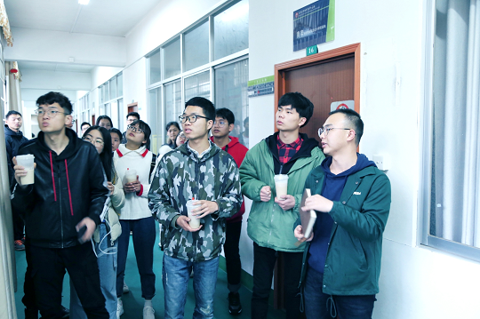 我校学生主任带领前来参观的财经学院的同学参观众创空间。